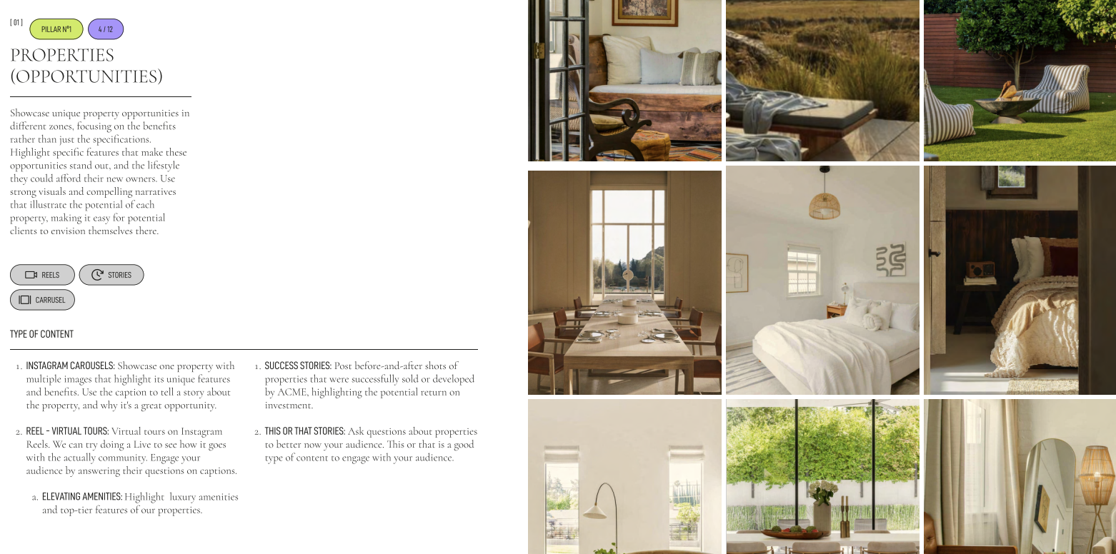 Challenge: ACME brokerage owners had a stagnating Instagram account with no aesthetic visuals, wanting to generate high-quality leads for multimillion-dollar homes. They also wanted to establish their identity as credible leaders in the luxury space, but images and videos were inconsistent, the account showed no growth, and frankly, the visual presentation was unappealing. There were no ideas for content, no concepts for aesthetic layouts, and no overall vision for social creative direction.